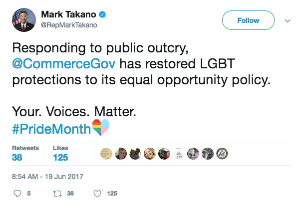 Mark Takano celebrated the public uproar that forced the Department of Commerce to keep language protecting LGBTQ employees in place: