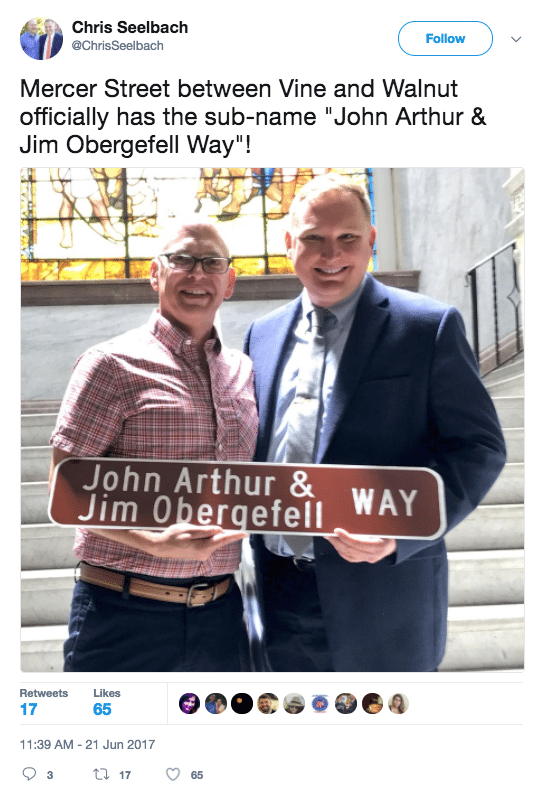 A street in Cincinnati has a new and historic name — in honor of the named plaintiff in Obergefell v. Hodges and his late husband just in time for the second anniversary of the Obergefell decision: