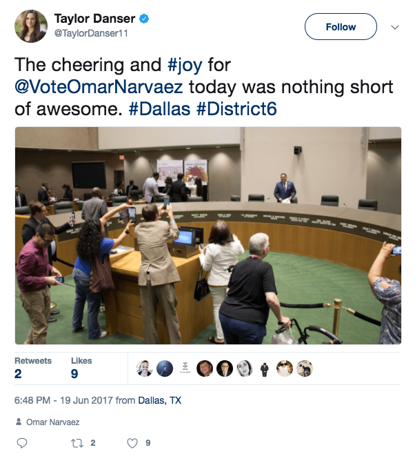 New Dallas City Councilman Omar Narvaez received a standing ovation on his first day: